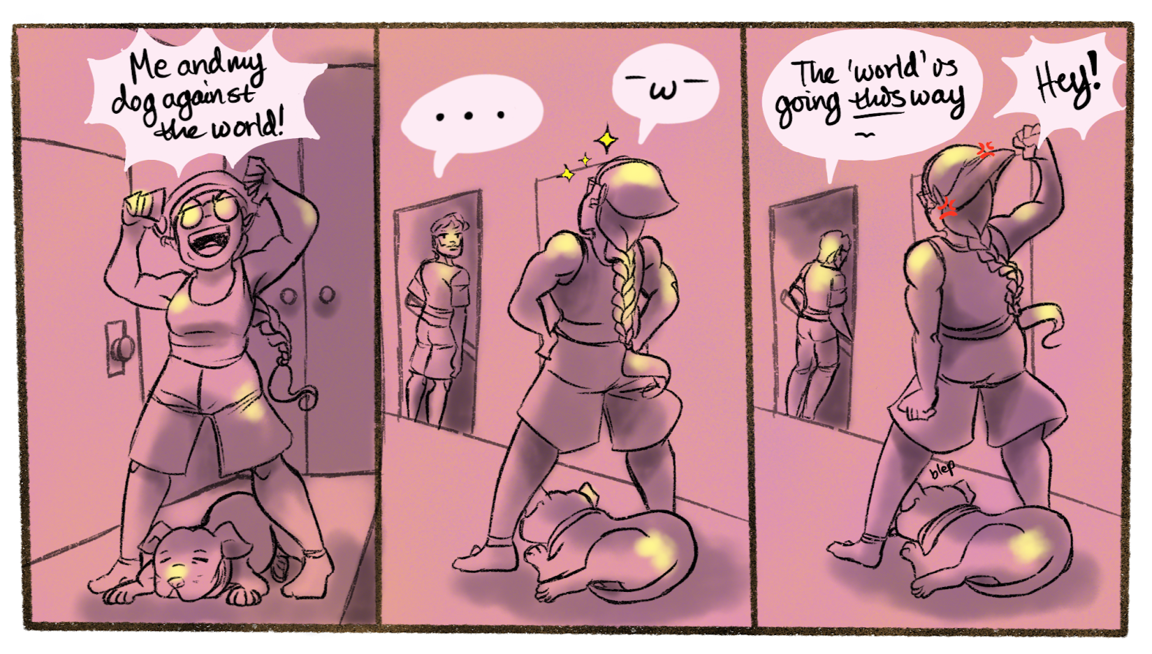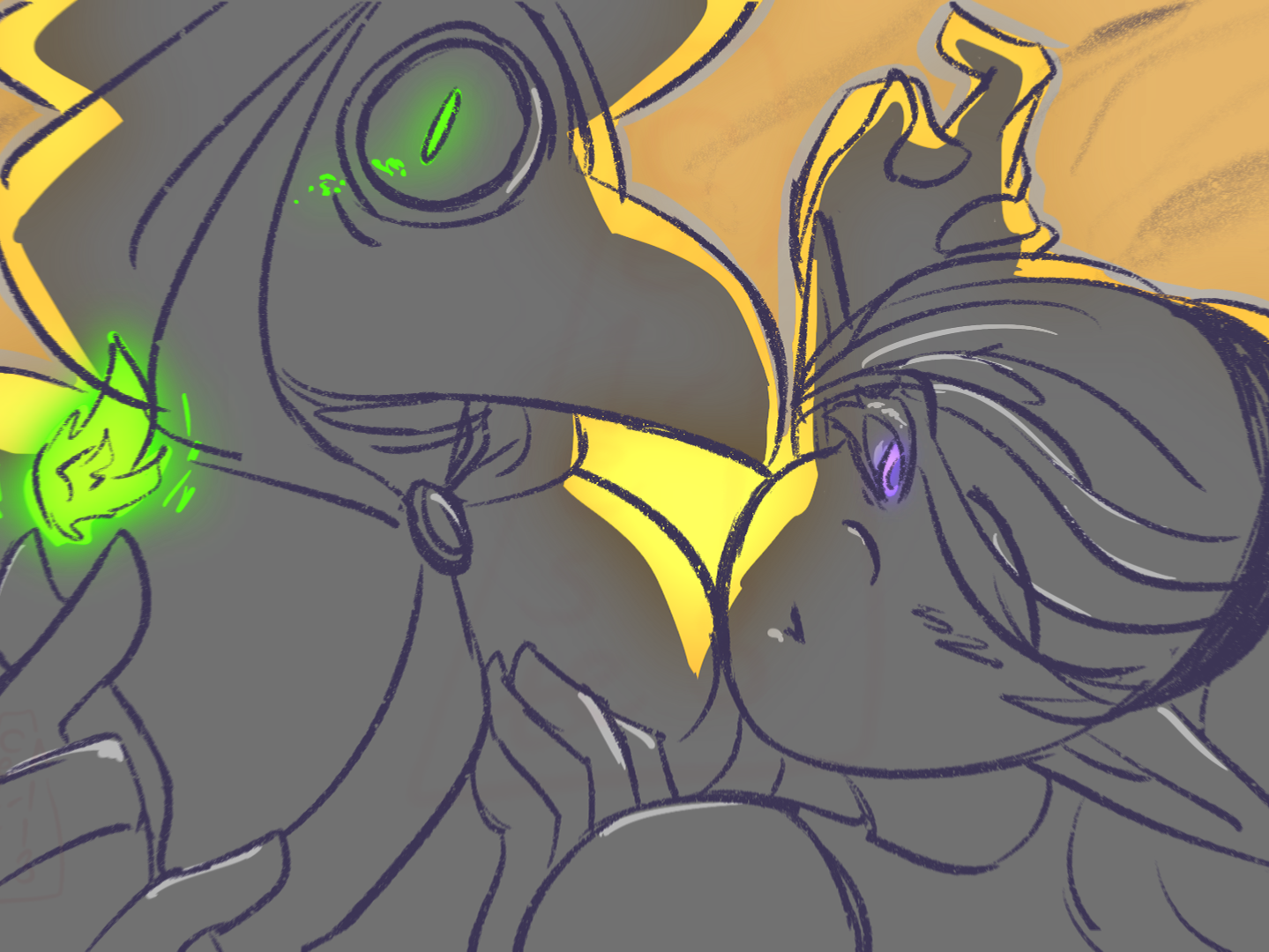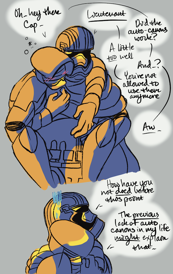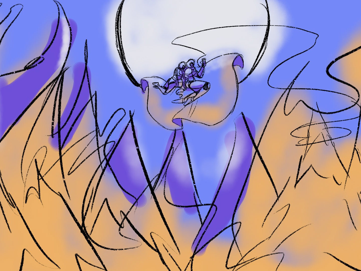 A comic/boards hybrid I made about Hilda scolding her roommate Nokk from Six Siege for using live ammunition to 'test' a new team member. I sketched this out (shown below) and then took it into Procreate with a 16:9 ratio canvas.